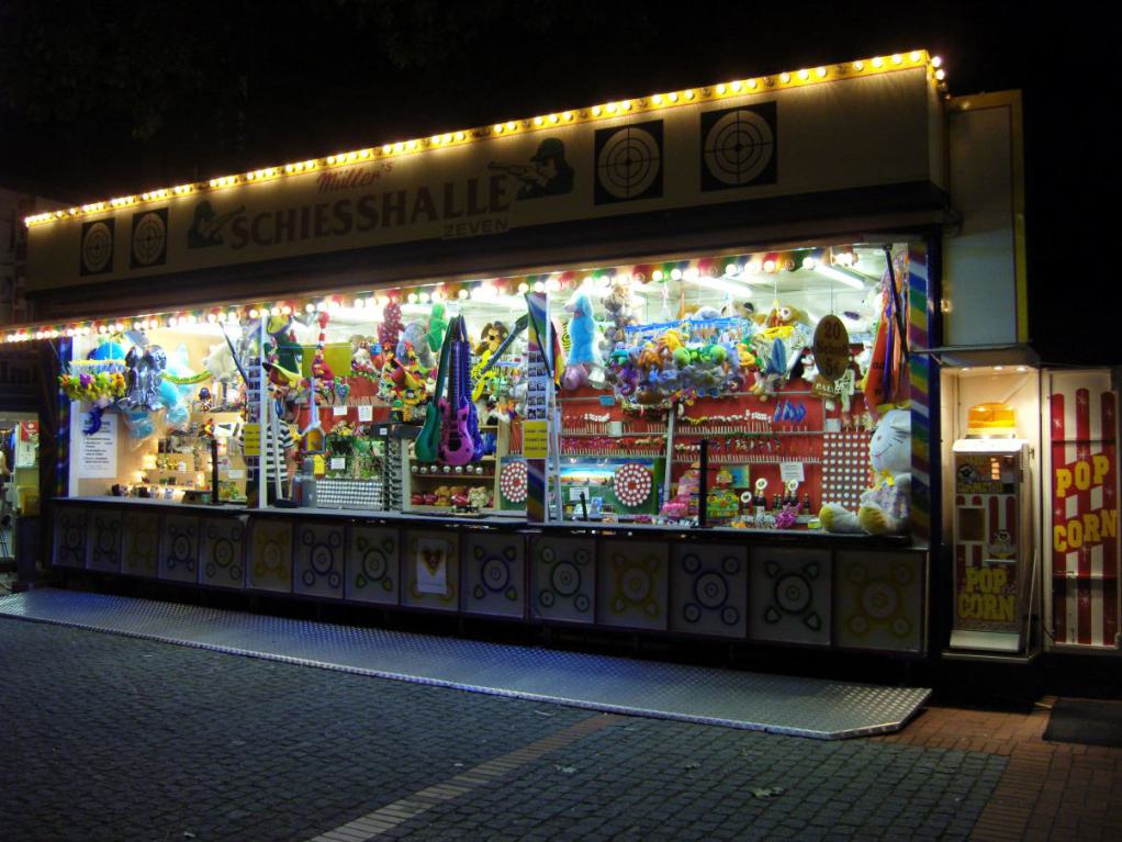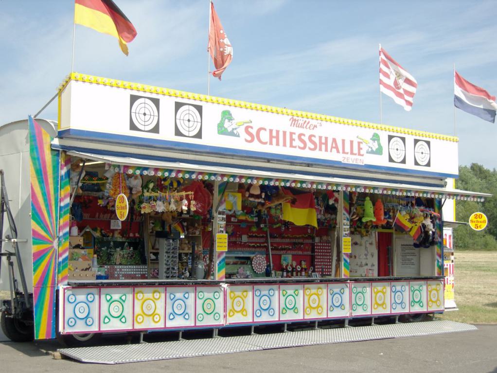 Unser Schießwagen reiht sich genau wie unsere Fahrgeschäfte in eine Reihe von Vorgängern ein, denn die Tradition klassischer Schießwagen und -stände hält sich in unserem Schaustellerbetrieb bereits seit über 50 Jahren. Unseren jetzigen Wagen führen wir ebenfalls schon seit langer Zeit. Er ist dezent beleuchtet und hat eine Gesamtlänge von ca. 10 Metern. Für den treffsicheren Schützen halten wir immer eine große Auswahl an attraktiven Preisen bereit.